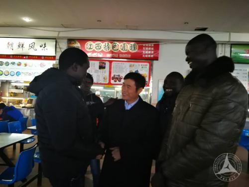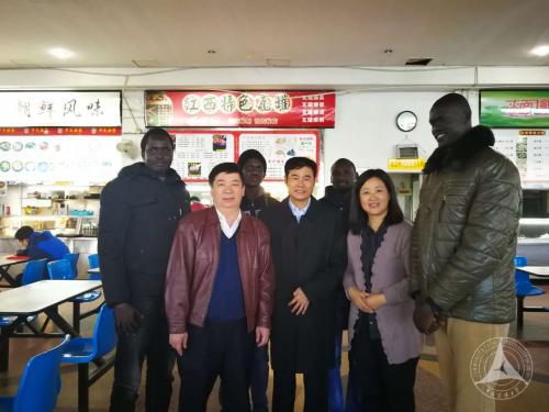 两位校领导很高兴与五位留学生在食堂偶遇,热情地询问他们在学校的学习和生活。陈书记用流利的英语直接和学生们交谈,问学生们来自南苏丹哪些部门,现在任课老师怎么样,习不习惯在学校的生活。学生们介绍了自己来华前的工作部门,其中两位同学来自南苏丹的信息部、两位同学来自苏丹高校、一位同学来自南苏丹媒体。学生们向两位校领导汇报了入学3个月来的感受,他们说,学校的老师不但上课认真敬业,同时也在生活等多方面帮助他们。一个学生指着张艳秋老师说,同学们都觉得张老师除了是教学项目负责人和任课老师外,也像妈妈一样关心学生。陈书记风趣地纠正说:“老师的关心是必须的,但张老师没那么老,应该是你们的姐姐”。学生们闻言点头称是。