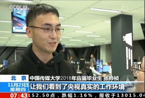 (通讯员 陈欣瑜)“央视邀请你,携手共进新时代!”11月22日下午,我校80余名2018届毕业生代表赴中央电视台新址参加央视2018年校园招聘宣讲会并参观总部大楼。这是央视历史上首次在总部大楼举办招聘宣讲会,也是其首次因校园招聘集中邀请我校等在京五所高校的毕业生走进央视参观。