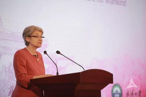 伊琳娜·博科娃在致辞中说:“在一个全球化和相互关联的世界里,我们看到人类思想和科学技术的巨大进步。与此同时,我们也面临影响所有人类的挑战 。习近平主席提出了‘一带一路’倡议,这一世纪计划聚焦文化交流,关注教育和科学领域的合作,为发展和繁荣开辟新的机遇。”她指出:“彭丽媛教授是联合国教科文组织女子教育特使,中国和联合国教科文组织还共同设立了女子教育奖。大学在推动女性教育方面扮演着至关重要的角色,我们要通过教育和学习来实现两性平等和赋权女性。”
