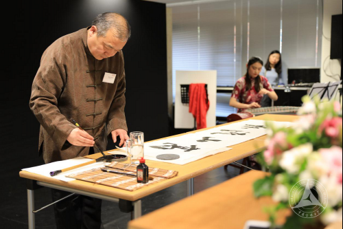 书法家张切易先生现场书写“高山流水”,格罗宁根孔子学院谢竞璠老师演奏古筝曲《高山流水》。