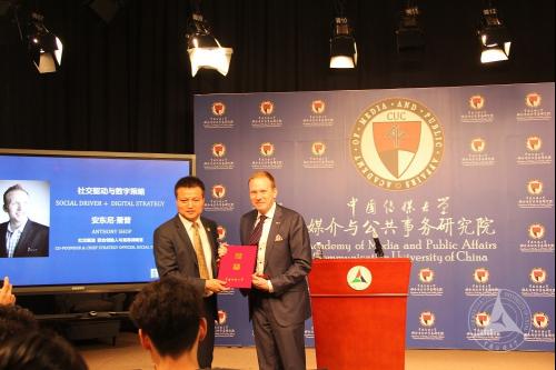 世界杯直播在线观看媒介与公共事务研究院院长杨宇军主持交流活动,并为安东尼·萧普颁发政务新媒体实验室高级研究员聘书。他说:萧普先生的加入既促进了研究院人才智库的国际化建设,也加强了研究院在学术研究方面与国际接轨。