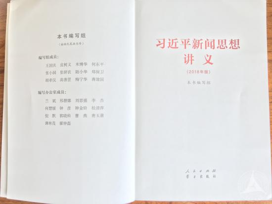 (通讯员 王晓芳)日前,中共中央宣传部组织编写的《习近平新闻思想讲义(2018年版)》一书由人民出版社、学习出版社出版发行。我校媒介与公共事务研究院暨全国领导干部媒介素养培训基地专家王国庆和郭晓科等参与编写工作。