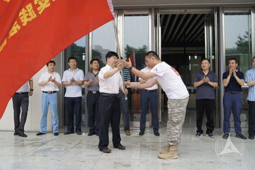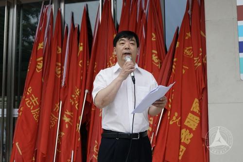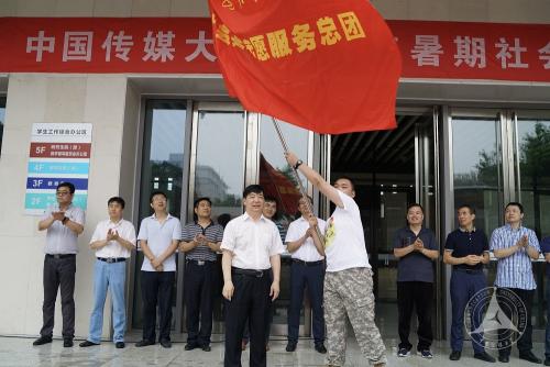 在出征仪式的授旗环节中,到场的各职能部门领导为即将出征校级团队代表授社会实践志愿服务团旗,各学部(院)领导为各自学部(院)团队授社会实践志愿服务团旗。最后,姜绪范副书记授出了今年社会实践的总团旗,这也标志着我校2018年暑期社会实践活动正式开始。