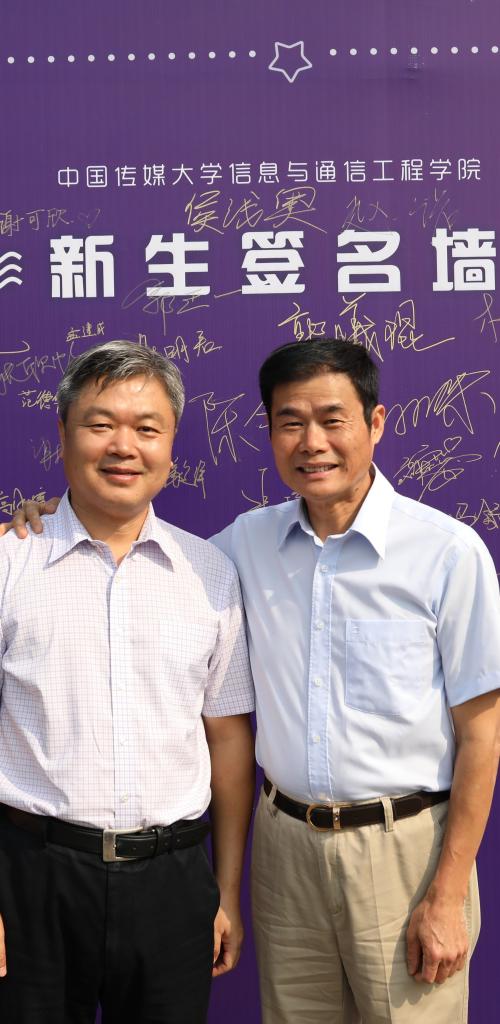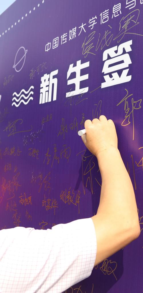 在信息与通信工程学院迎新接待点,校领导应邀在巨幅“新生签名墙”前签名并合影留念,重温入学报到的喜悦。