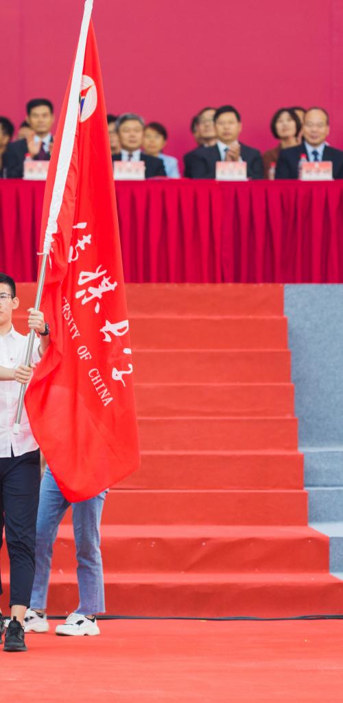 典礼在庄严的《国歌》声中开始。廖祥忠校长首先致辞,他代表学校向来自79个国家和地区的4903名2018级新生表示热烈欢迎。他表示,在六十余年的办学历程中,学校致力于培养信息传播领域高层次人才,形成了自己鲜明的办学特色和独特的中传文化。廖校长将中传文化基因阐释为“忠诚、自信、包容、竞先”,希望同学们对党和国家忠诚、对人民忠诚、对事业忠诚;满怀自信,勇于面对学习和生活中的一切艰难困苦;以包容的气度面向未来,兼收并蓄、博采众长;勇于创新,敢于竞先。