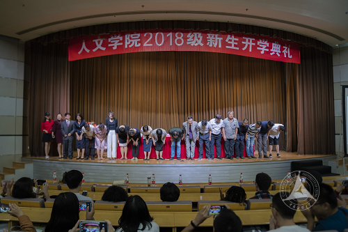 典礼在悠扬的《年轻的白杨》音乐声中开始。资深教授、人文学院院长张晶教授首先致辞,他表示这是人文学院成立后第一次开学典礼,“乐莫乐兮新相知”,他代表人文学院全体教职工对入学新生表示热烈的欢迎。之后,张晶院长对新生数据、学院历史、师资力量,教学科研业绩等情况进行了详细介绍。他表示:人文学院是一个年轻的学院,却有着光荣的历史、深厚的积淀、厚重的师资力量。