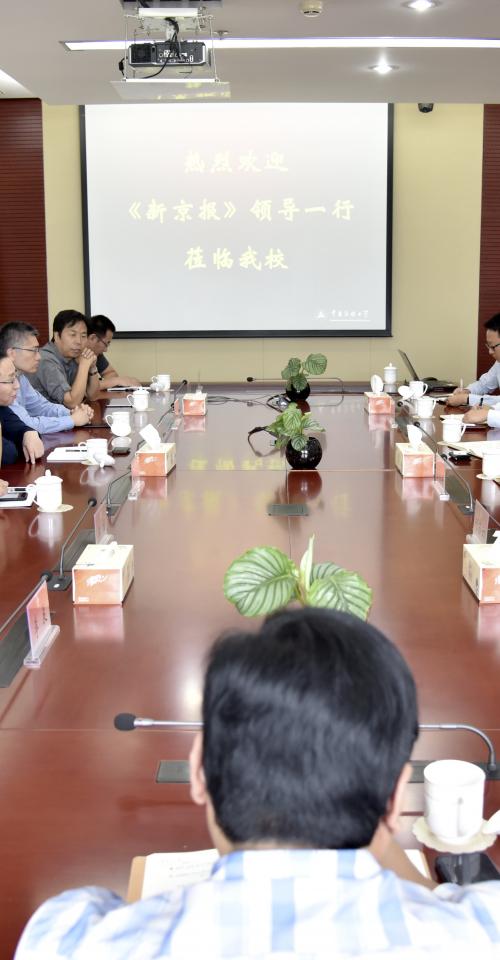 (新闻中心记者 宋佳音 摄影 孙浩)9月19日上午,新京报社长宋甘澍,常务副总编李海,执行总裁张学冬,副总编王爱军,编委李程、于德清,新京报传媒研究院李晨一行来我校洽谈交流。陈文申书记、段鹏副校长会见宋甘澍社长一行。党政办、宣传部、科研处、新闻学院、电视学院、传播研究院等相关部门负责人参加会议。