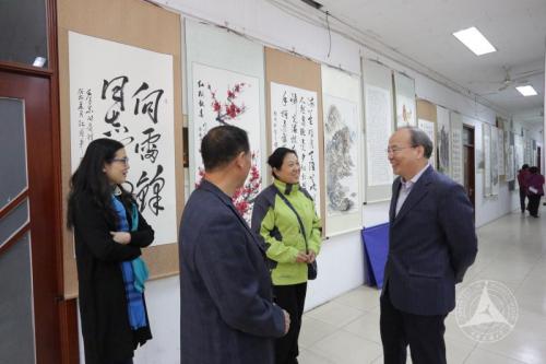 书画展共展出130幅作品,包括书法作品50幅,绘画作品80幅。这些作品分别由老年书画协会和书画学习班选送。书画协会选送作品104幅,其中书法41幅,绘画63幅;书画学习班选送作品26幅,其中书法作品9幅,绘画作品17幅。参展作品的创作者有的已是耄耋之年,有的尚是入门新秀,作品在题材上百花齐放,风格多样,或豪迈或奔放,或绮丽或秀美,异彩纷呈。刘守训副校长参观了画展并和书画爱好者们一起饶有兴致地品味展品、亲切交谈。