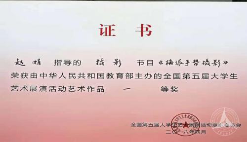 (通讯员 武瑶)近日,由我校戏剧影视学院赵娟副教授指导,2014级戏剧戏曲学博士研究生俞丽伟同学创作的作品《梅派手势摄影》获得由教育部主办的全国第五届大学生艺术展演活动艺术作品一等奖。此前,该作品已获2017北京市大学生书画作品展摄影类金奖。