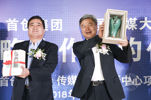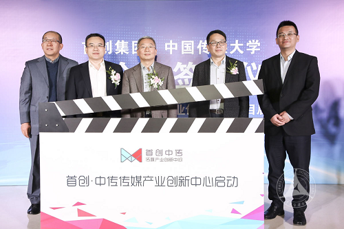 随着战略协议的签定,首创集团下属上市公司首创置业与世界杯直播在线观看校属企业联袂打造的产学研转化平台——首创·中传 传媒产业创新中心也宣告正式启动。中心将依托首创成熟的产业运作能力,联合世界杯直播在线观看丰富的人才、智力和技术等方面的优势资源,建立起一个高效的产学研转化平台,打造具有国际影响力的传媒产业创新发展新模式。我校副校长张树庭、产业管理办公室主任徐宝泉与首创集团副总经理苏朝晖、首创置业党委书记李晓斌、首创创投董事长夏海峰共同上台见证了这一历史时刻。