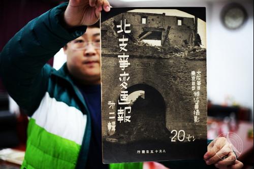 工作人员展示藏品中的战时刊物——《北支事变画报》