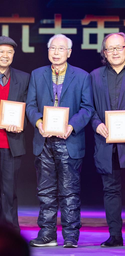 我校电视系首任主任矫广礼(左一)和中视协纪录片学术委员会名誉会长刘效礼(右一)为孙玉平、童国平、刘湘晨颁发特殊贡献奖