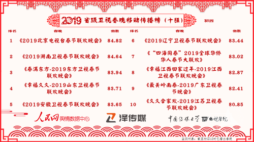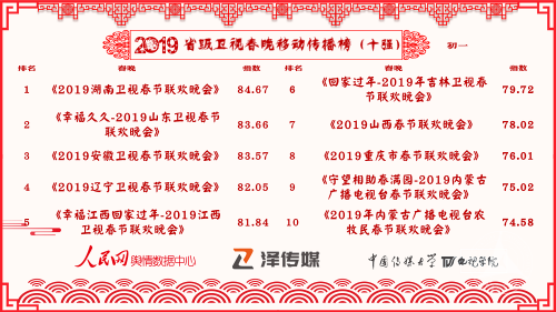 本次监测自2019年春节第一天开始,初一到初五每日发布一次榜单。截至大年初一12时,已播出的省级卫视春节晚会在移动端传播十强名单统计如下: