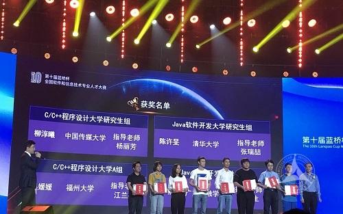(通讯员 杨丽芳)第十届全国软件和信息技术专业人才大赛( 简称“蓝桥杯”)的全国总决赛于2019年5月25日在北京举行,我校2017级录音工程专业研究生柳淳曦、2017级广播电视工程专业刘宗鑫、2016级信息安全专业邓楚盟、2016级计算机科学与技术专业韦怡从蓝桥杯省赛中脱颖而出,代表我校参加了全国总决赛。在总决赛中,柳淳曦同学代表我校获得C/C++程序设计研究生组特等奖(全国第一),韦怡和刘宗鑫同学获得C/C++程序设计大学A组三等奖,邓楚盟同学获得优秀奖。我校与清华大学、北京大学、北京航空航天大学等50所高校一起获得全国总决赛软件类优胜学校称号。本次比赛由计算机与网络空间安全学院杨丽芳老师及信息与通信工程学院于鹏老师担任指导老师。全国总决赛的参赛选手均为第十届蓝桥杯各大省赛一等奖的获得者。