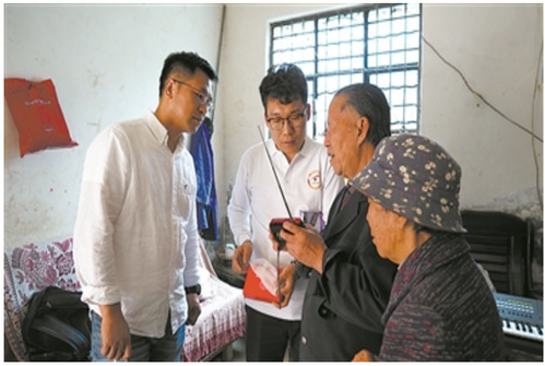 2019年9月25日,世界杯直播在线观看电视学院党委书记曾祥敏(左一)携“光明影院”志愿者走进四川省凉山彝族自治州视障人士家中