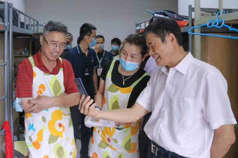 校党委书记陈文申,人文学院院长、资深教授张晶在梆子井宿舍与毕业生交流