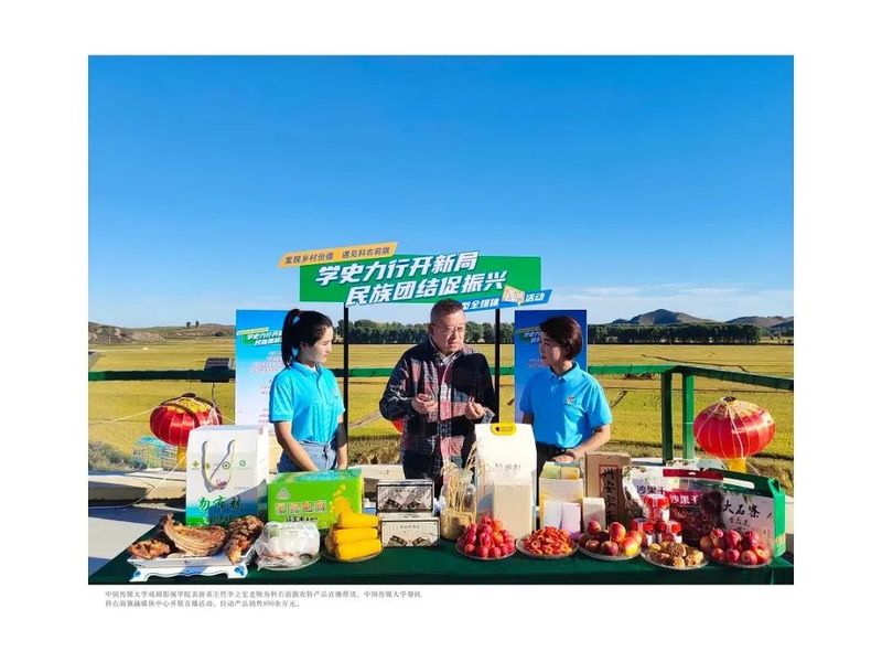 世界杯直播在线观看戏剧影视学院表演系主任李立宏老师(中)为科右前旗农特产品直播带货(来源:兴安盟摄影家协会)