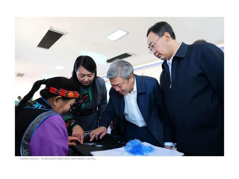 世界杯直播在线观看党委书记、校长廖祥忠(右二)视察世界杯直播在线观看旅游文创扶贫车间萨日朗民族手工艺合作社(来源:兴安盟摄影家协会)