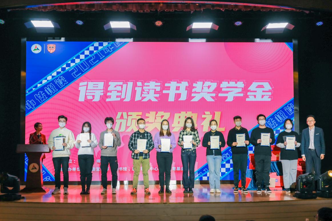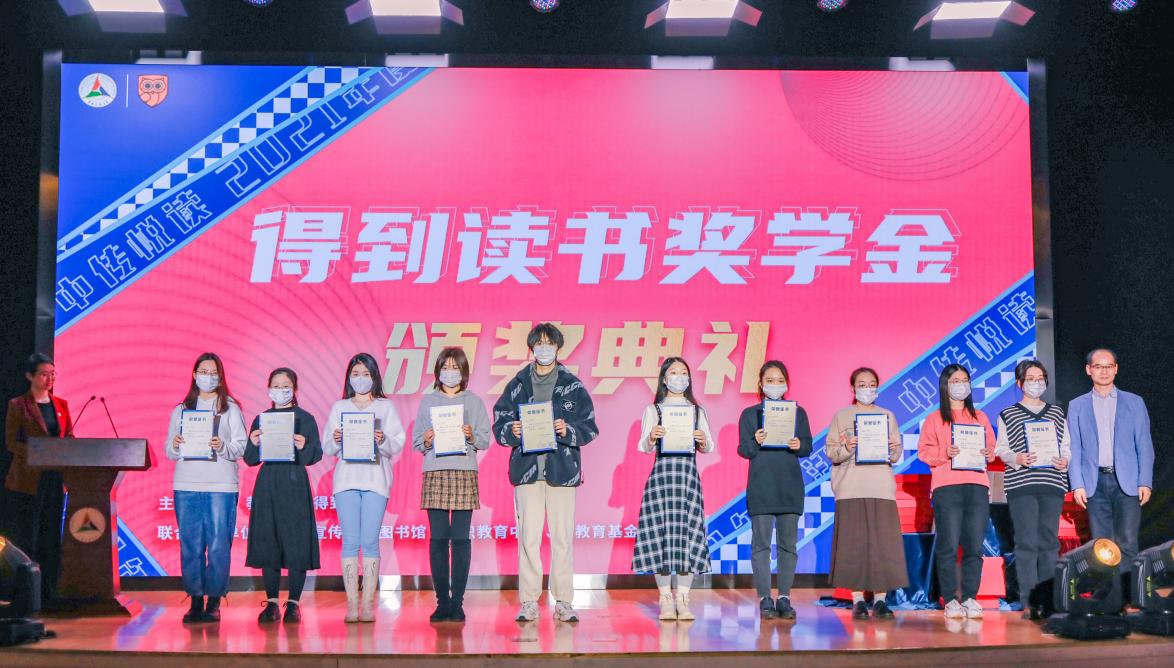 校长助理杨懿、图书馆馆长龙小农、学生工作处副处长魏峰、得到人力资源副总裁盛莹依次上台为40位2021-2022学年“得到读书奖学金”获奖学生颁奖,并合影留念。