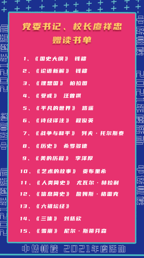 本次颁奖典礼特别准备了15个“隐藏款”惊喜盲盒,里面是党委书记、校长廖祥忠为同学们推荐的15本经典图书书单,图书扉页上是廖书记的亲笔寄语“好好做个读书人”“中传,一个随时点亮你心灯的神奇地方”。“新年图书盲盒”抽取将活动推向高潮。