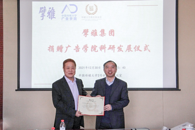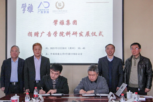 (通讯员 杨子航 陈怡)2021年12月30日上午,北京擘雅文化集团有限公司与我校签署协议,捐赠1000万元(首期资金140万元),支持帮助广告学院科研建设,助力我校科研发展。