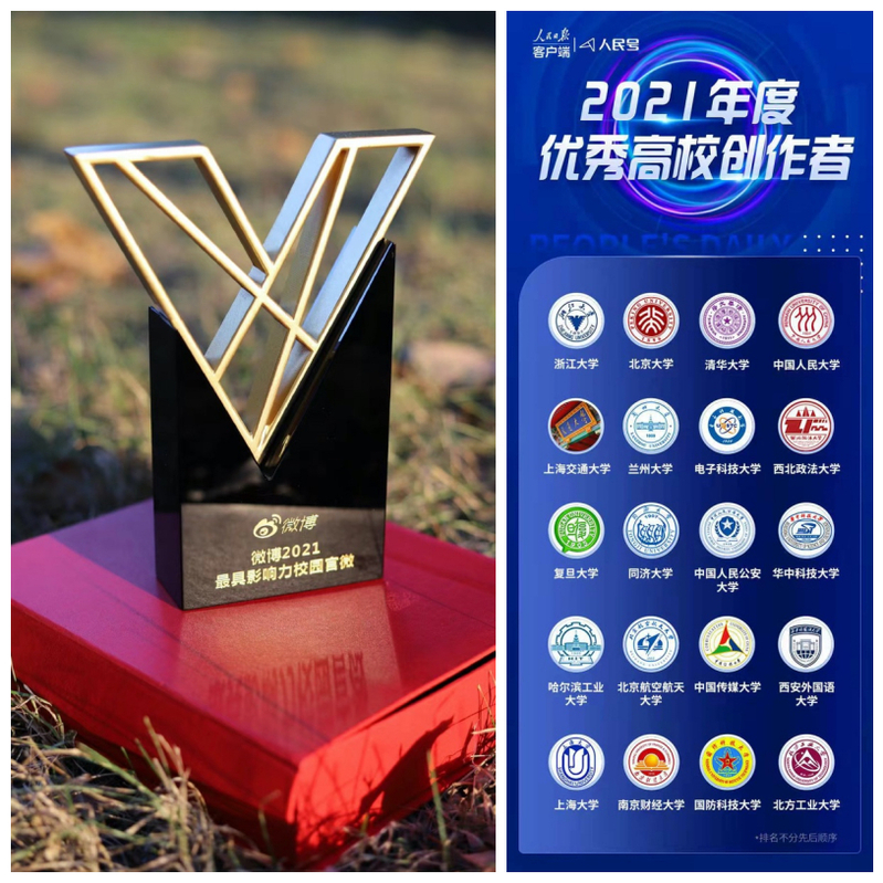 今年,学校各媒体平台持续发力,获得了一系列佳绩。官方微博被评为2021年度“最具影响力校园官微”,官方人民号获得2021年度“优秀高校创作者”荣誉。