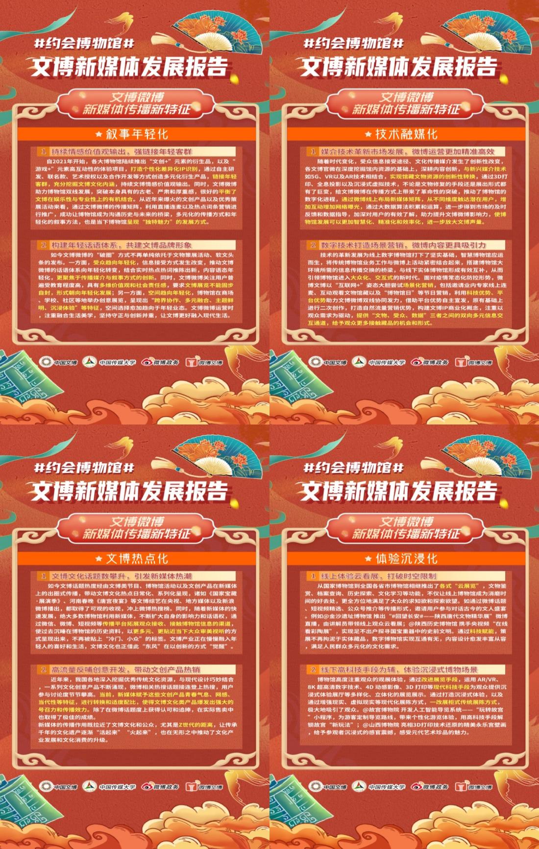 一、传播多元化。微博直播、连麦、短视频等新形式受到文博圈层的广泛欢迎与应用,云展览、云交互等多元场景进一步提高了文博的影响力。二、叙事年轻化。文博微博融合网络流行语、转换Z世代交流思维,吸引更多年轻用户走近文博文物,进行娱乐化表达和文化式解读,在守正与创新并重中激活青年文博新势力。三、技术融媒化。文博新媒体矩阵创新不断深化,跨平台互联技术日趋成熟,线下链接线上,文博微博云生态加快建构。四、文博热点化。文博大事件勾连文娱综艺热点,融合媒体赋能文博出圈,让文博“活起来”“火起来”。五、体验沉浸化。文博新媒体深耕内容IP,创新形式表达,通过全景展览、感官交互等形式满足用户沉浸体验需求,实现文博育人,加快推进文博微博新媒体传播升级。