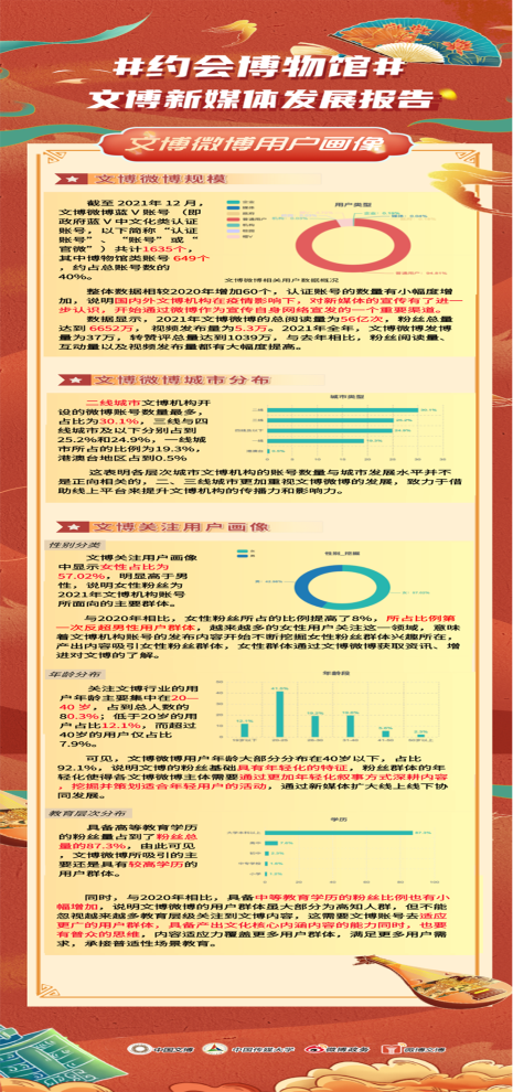 报告全面梳理了2021年度文博微博粉丝画像、新媒体传播特征、年度案例盘点、趋势特征等内容,客观反映了文博微博新媒体的年度发展情况。结合跨域输出、“双减”政策等新形势,报告提出了文博未来在新媒体领域内发展的新思路、新趋势。