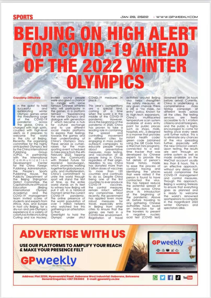 博茨瓦纳留学生,2021级传播学专业博士生Gopolang Ditlhokwa(中文名:戈波朗·迪特赫科瓦)所著的文章《2022年北京冬奥会前,北京严防新冠疫情》(Beijing on High Alert for Covid-19 Ahead of the 2022 Winter Olympics)刊登在《GP周刊》(GPweekly)。该刊物全称为Global Post weekly newspaper,是博茨瓦纳的时事在线报纸,旨在向读者揭开世界的面纱。