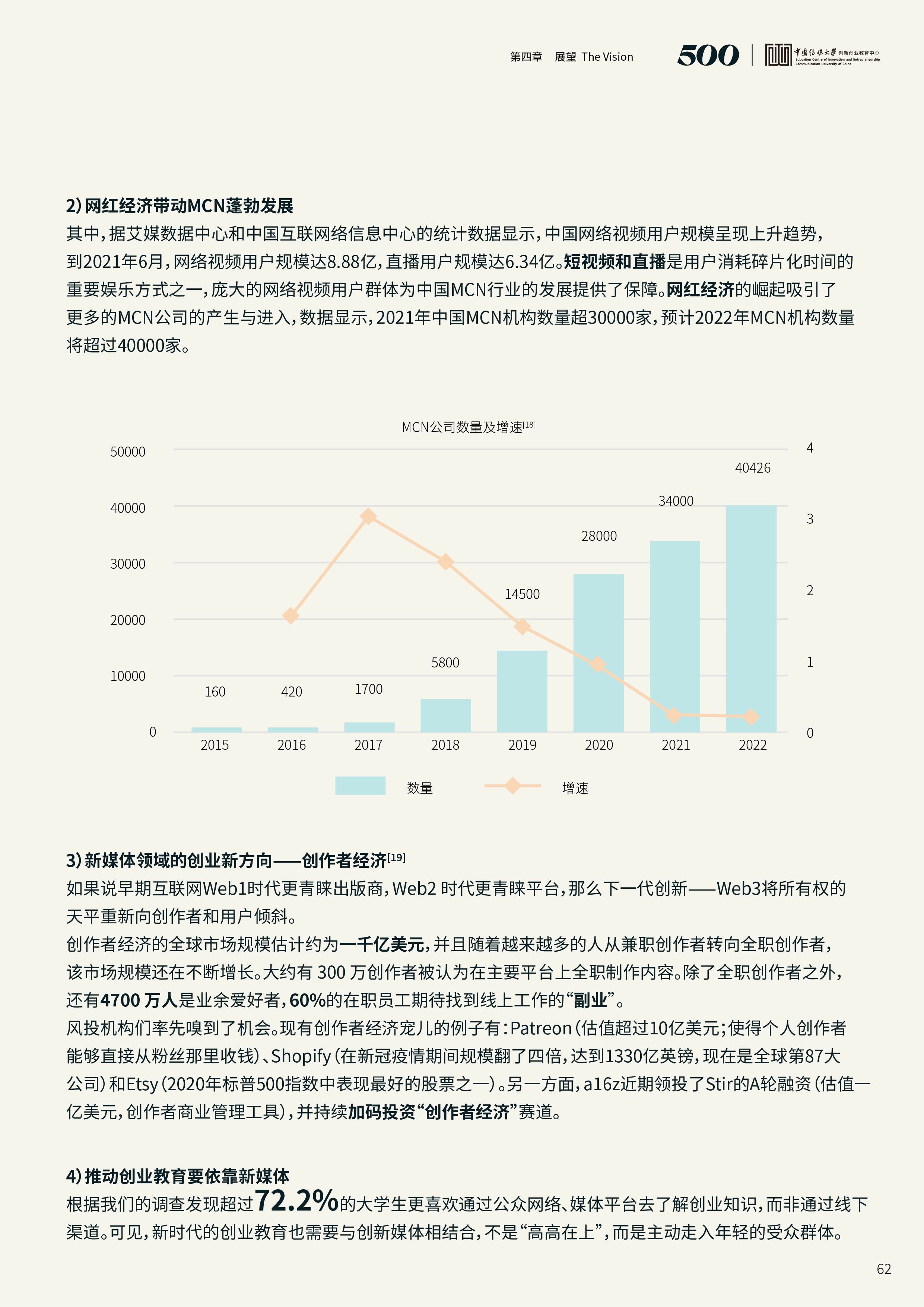 报告总结了2021年大学生创业十大趋势。其中,“新媒体对创业越来越重要”是一大重要趋势,MCN、创作者经济等成为大学生创业的新方向。此外,报告也总结了“全球高校创业规模形成‘中美领跑’格局”“创业能力会成为未来人才评估的基本要素”等发展趋势。