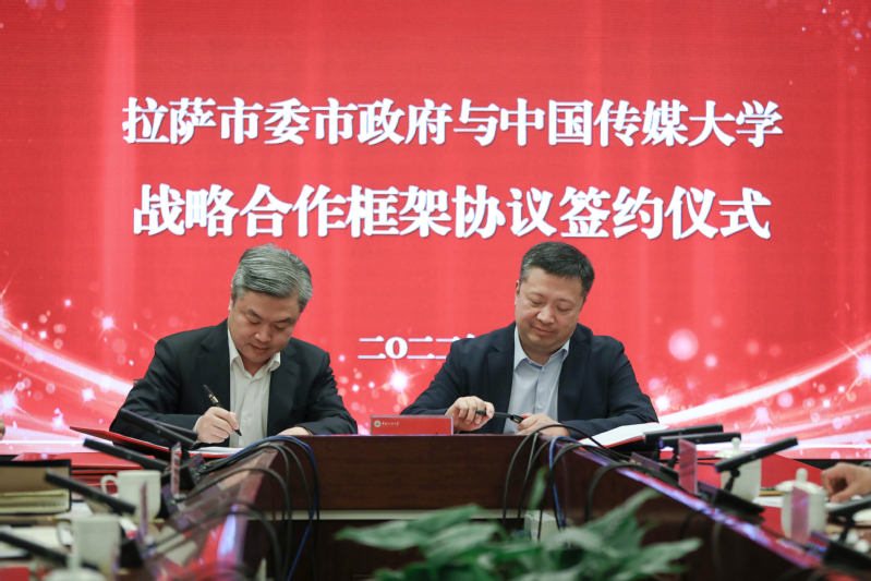 拉萨市委宣传部副部长、市广电局党组书记龚大成,拉萨市商务局党组书记扎西平措,拉萨市委、市政府驻京办事处党组书记谢海荣,市融媒体中心党组书记蔡新平;我校党委常委、校长助理、宣传部部长杨懿,党政办公室主任张绍华,学生工作部(处)部(处)长郭婧娜,国内交流与合作处处长、校友工作办公室主任刘首兵,教育发展中心党总支书记、培训教育管理处处长王化南等参加签约仪式。