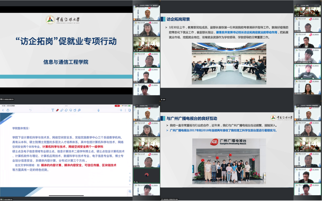 (通讯员 王雨晨 邸国桐)为贯彻落实教育部办公厅关于“书记校长访企拓岗促就业专项行动”的工作部署,深入挖掘就业资源,拓宽就业渠道,4月28日下午,王晖副校长带队与广州广播电视台在线开展“访企拓岗促就业”校台交流会,会议由信息与通信工程学院党委副书记钟丹丹主持。