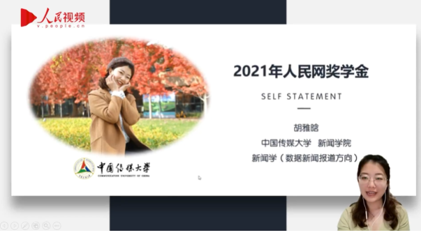 (通讯员 柳帆)5月17日下午,2021年度人民网奖学金终评及颁奖发布会线上举行,最终评选出2021年度人民网奖学金一、二、三等奖获得者共30名。我校新闻学院2018级新闻学(数据新闻报道方向)本科班胡雅晗同学参与终评答辩并获二等奖。