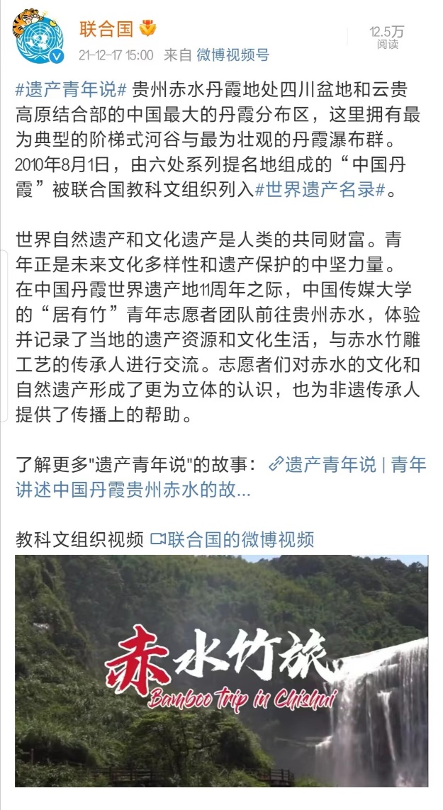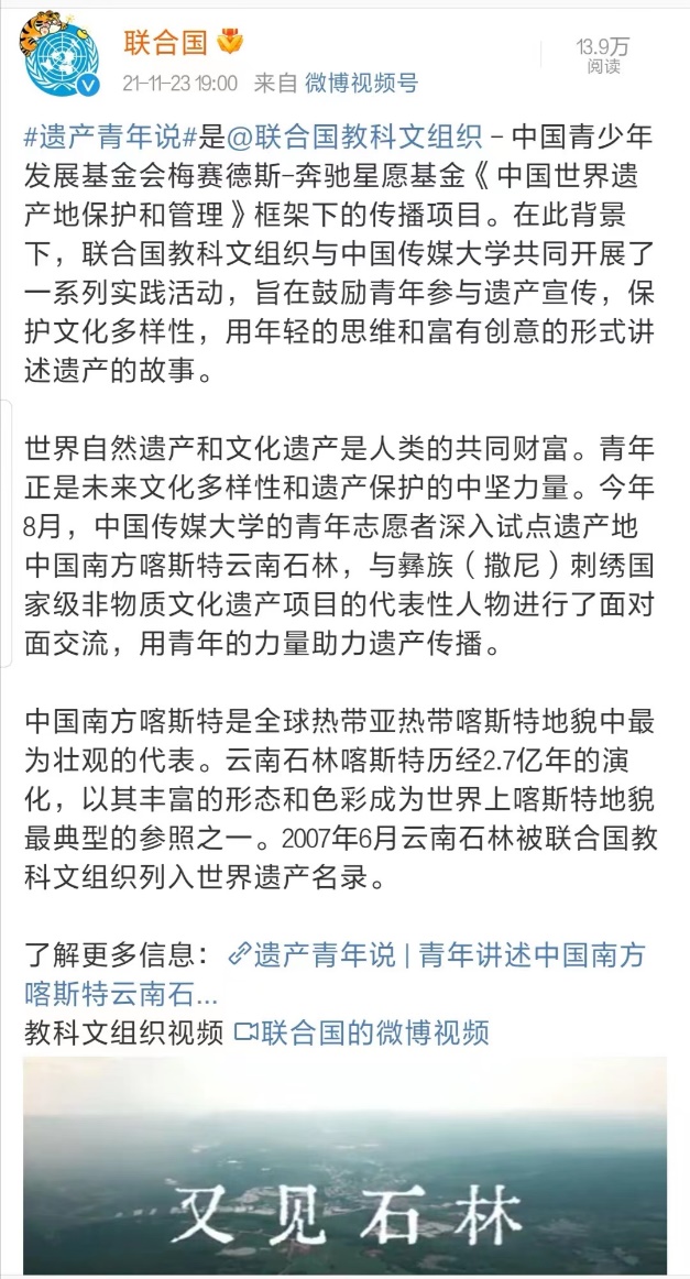 近两年来,世界杯直播在线观看文化产业管理学院非遗传播研究中心在联合国教科文组织驻华代表处的指导下,开展了一系列遗产传播相关科研和实践,共同发起了“遗产青年说”线上线下传播活动。我校师生在云南石林、贵州赤水等地开展的“遗产青年说”活动得到了联合国官方微博的报道。