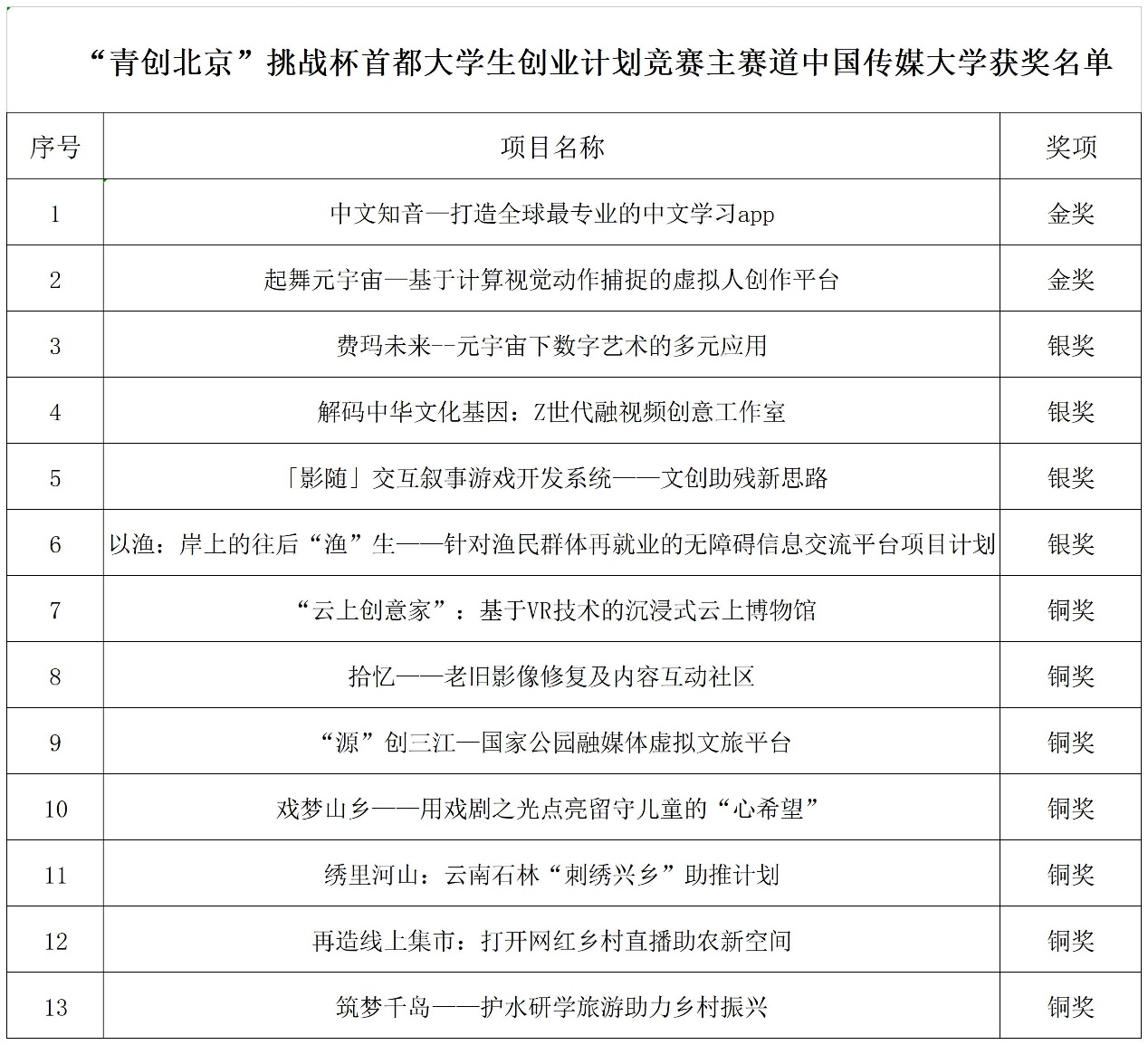 本届“挑战杯”设置了“一杯五赛”的赛道分布。“一杯”指主赛道,分为“科技创新和未来产业”“生态环保和可持续发展”“文化创意和区域合作”“乡村振兴和农业农村现代化”“城市治理和社会服务”五个主题。专项赛道设置“青振京郊”“青绘团史”“青力冬奥”“青系四海”“青创副中心”五大板块。我校推荐参评的《中文知音——打造全球最专业的的中文学习APP》《起舞元宇宙——基于计算视觉动作捕捉的虚拟人创作平台》获主赛道金奖,《“人杰地灵,水色山光”——基于举人IP形象“阿水”的线上线下一体化文旅融合项目》获“青振京郊” 专项赛道金奖。