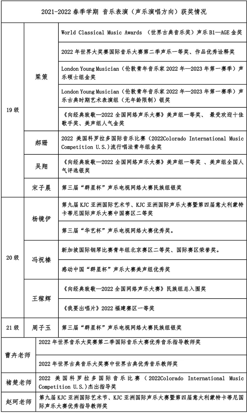(通讯员 赵珂)2021—2022春季学期期间,音乐与录音艺术学院声乐演唱专业的同学们在完成课内学业任务的基础上,积极参加国内国外的各项专业比赛,不断挖掘自身的演唱潜力、提升自己在“唱”“演”等方面的综合水平与综合能力,用实践检验自身所学,并取得了多项殊荣,体现了本专业高质量、高层次的教学水平与人才培养水平。