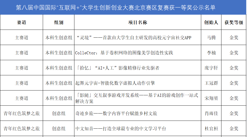 与此同时,我校“起舞元宇宙-智能化数字虚拟人动作引擎”、“ColleCtor:基于卷积网络的图像美学创造性实践”项目进入北京市冠军争夺赛,这也是我校参赛队伍在主赛道第一次进入冠军争夺赛,最终“起舞元宇宙-智能化数字虚拟人动作引擎”项目获得北京市第22名,新文科赛道北京市第二名的好成绩。