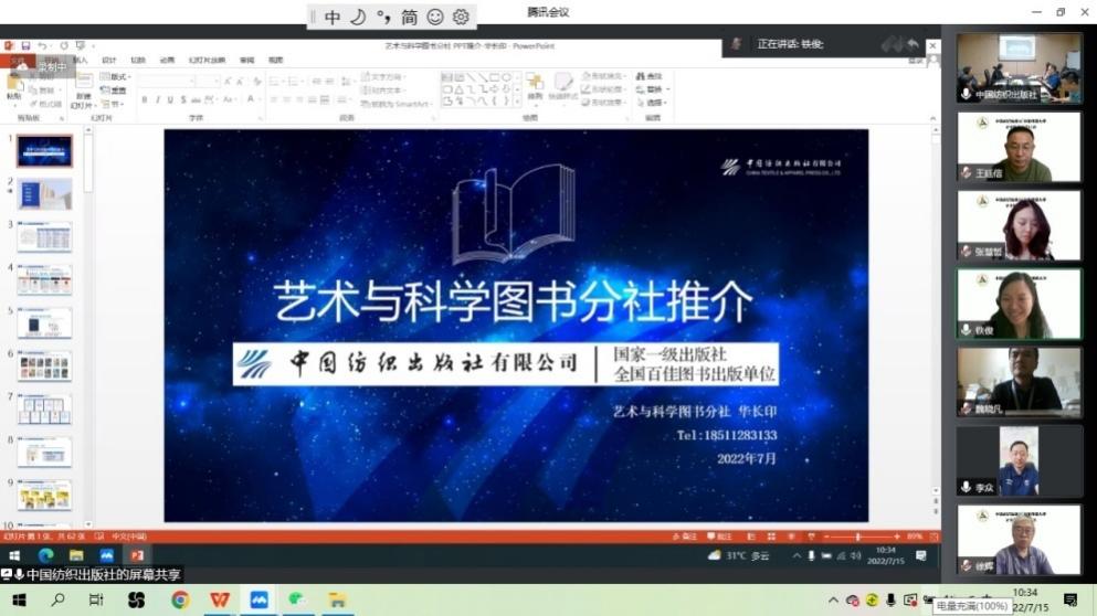 中国纺织出版社总编辑李炳华、出版社副总编辑兼总编室主任郭慧娟、出版社人力资源部主任助理谭丽、出版社人力资源部招聘主管兼团委书记王晓敏参会。世界杯直播在线观看学生工作部(处)(武装部)齐金贵,艺术研究院副院长徐辉、艺术研究院党政办公室主任张慧喆、《艺术传播研究》期刊编辑魏晓凡、学生工作办公室张倩参加了线上交流。