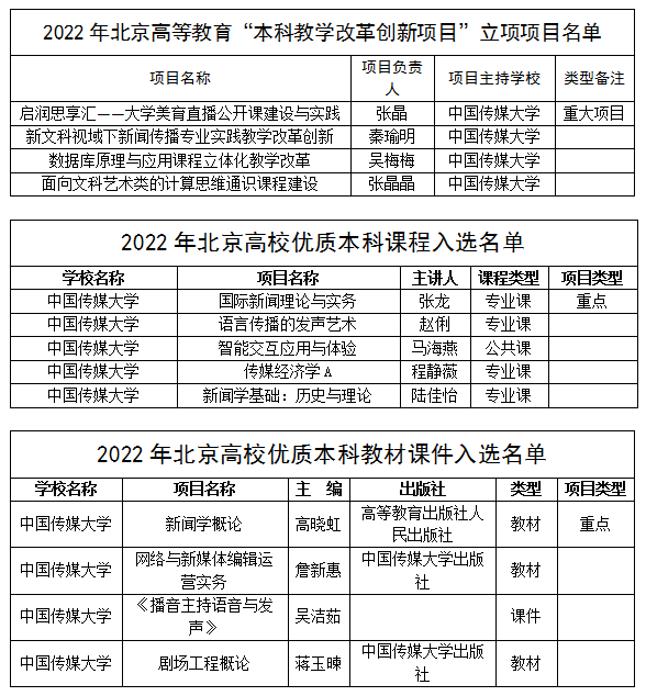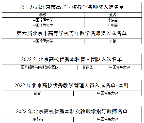 (通讯员 付李琢)近日,北京市教育委员会公布了2022年度北京高等教育“本科教学改革创新项目”立项项目名单、北京高校“优质本科课程”和“优质本科教材课件”评选结果、北京市高等学校教学名师奖获奖名单、“北京高校优秀本科育人团队”和“北京高校优秀教学管理人员”评选结果,我校推荐的项目全部入选。其中,北京高等教育“本科教学改革创新项目”获批立项4项,包括重大项目1项,这是我校自2019年首次获批重大项目之后再次获批重大项目;北京高校“优质本科课程”和“优质本科教材课件”获评9项,其中重点项目2项,一般项目7项,对于5位获评北京高校“优质本科课程”的主讲教师,认定为“北京高等学校优秀专业课(公共课)主讲教师”;北京市高等学校教学名师奖获评3人,其中教学名师2人,青年教学名师1人;“北京高校优秀本科育人团队”获评1个;“北京高校优秀教学管理人员”获评1人;北京高校优秀本科实验教学指导教师”获评1人。具体名单如下: