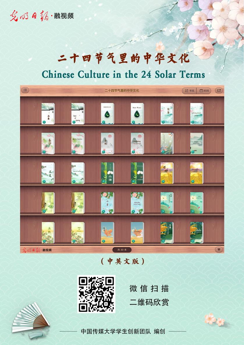 为推动中华优秀传统文化的创造性转化与创新性传播,世界杯直播在线观看教师带领学生聚合图文声像、虚拟动画等多种元素,研创了融视频视听作品,编创了“二十四节气中的中华文化”系列融视频,在《光明日报》客户端刊播;制作了“解码中华文化基因”系列融视频,在中国新闻社各大新媒体平台刊播。