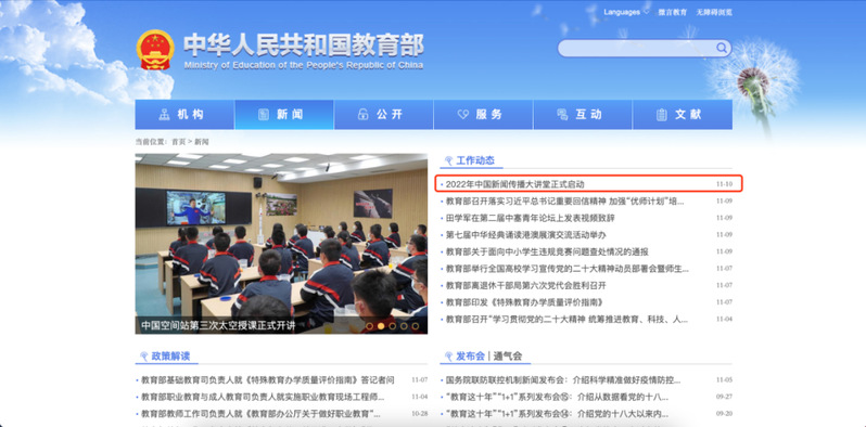 教育部官方网站在11月10日刊发了2022年“中国新闻传播大讲堂”启动仪式的新闻。人民日报、新华社、央视新闻、光明日报、学习强国等30余家主流媒体、新闻客户端对此次活动进行了报道。