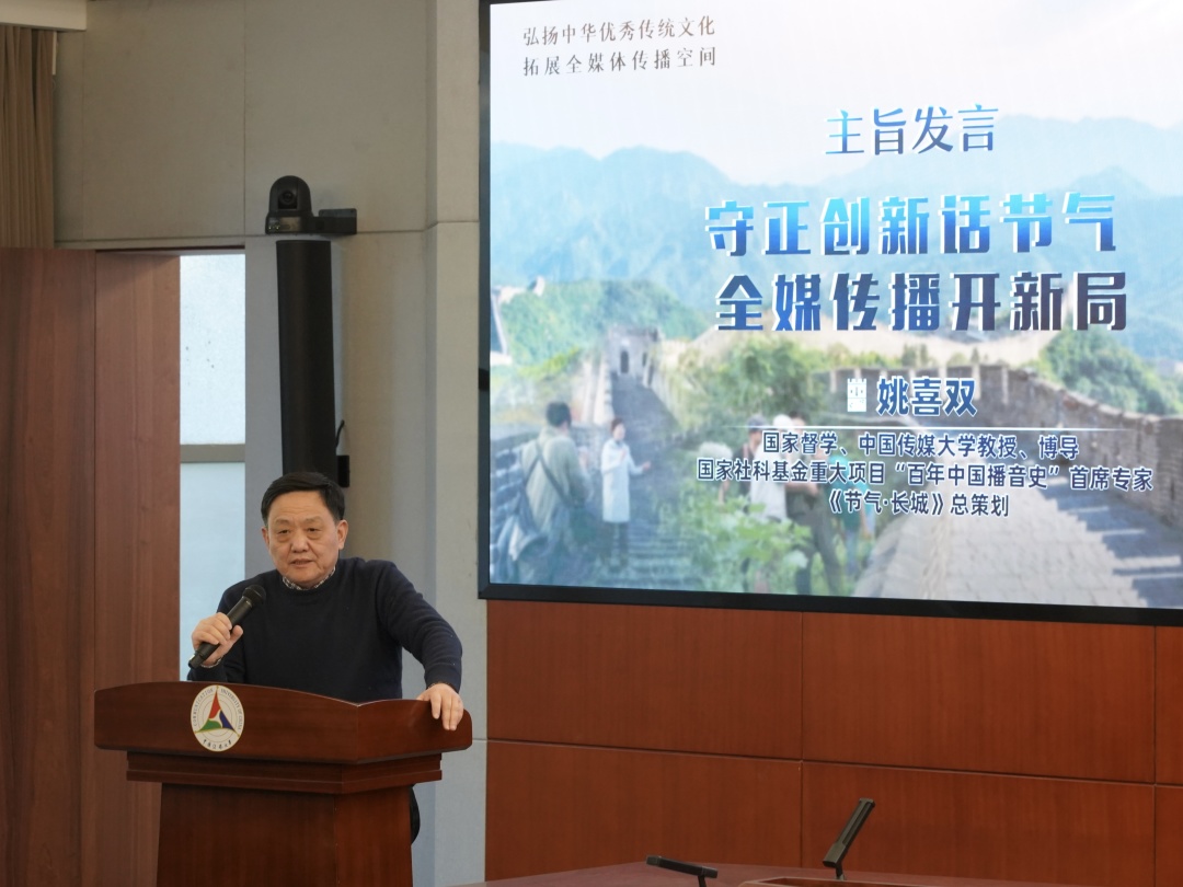国家督学、国家社科基金重大项目“百年中国播音史”首席专家、《节气·长城》总策划姚喜双教授作了题为《守正创新话节气 全媒传播开新局》的主旨发言。姚喜双教授结合《节气·长城》的创作过程对二十大报告中关于文化自信和全媒体传播体系建设的相关论述进行了深刻解读。姚喜双教授认为,《节气·长城》实现了“节气”与“长城”的深度融合、“大屏”和“小屏”的完美结合、“知识”和“文化”的有机结合。以敬一丹老师为代表的《节气·长城》创作团队体现了历史主动、体现了六个坚持、体现了高质量发展。