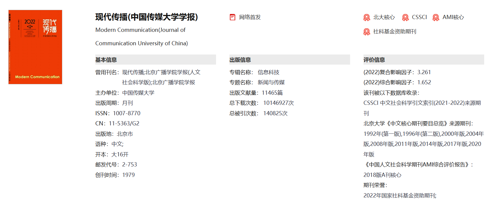 另悉,根据《中国学术期刊影响因子年报(2022版)》的数据显示,在影响力指数的他引TC值指标上,《现代传播》继续位列全国“信息与新闻出版学”刊物的第一名(他引2611次);在影响因子指数的复合影响因子方面,一举破“3”,为3.261,较之上一年度的2.443有较大突破。