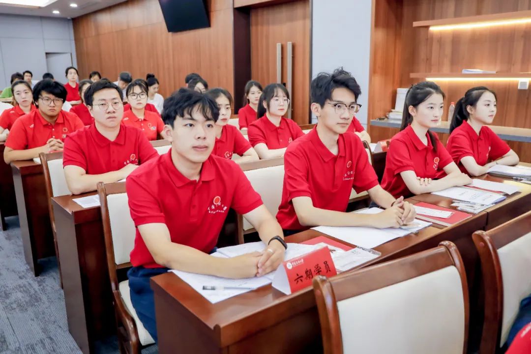 青马学院六期学员代表为七期学员代表佩戴院徽,两期学员交接院旗。