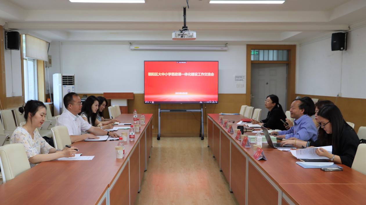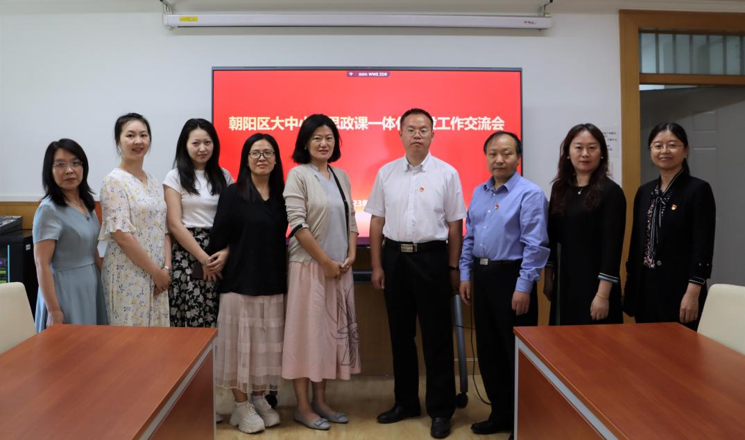 朝阳区思想政治教育指导评价中心思政教育部主任柳歆智,马克思主义学院党委副书记赵波、专职组织员孙靖,以及张梦然、张爱玲、姚旭、刘洁、原晋菲等双方参会人员围绕如何进一步推进大中小学思政课一体化建设进行了探讨交流。