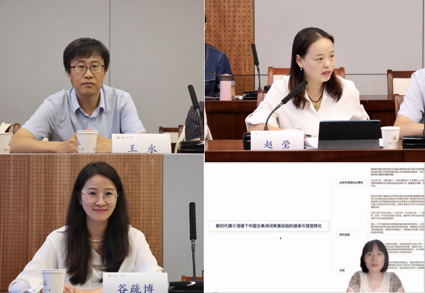 研讨环节由世界杯直播在线观看人文学院党委副书记赵莹副教授主持。首先,课题组成员人文学院王永教授、赵莹副教授、谷疏博副教授、解英华博士别以《“中华美学精神”美育辨识度调研分析》《以马克思主义文艺理论中国化时代化推进建设中华民族现代文明》《新媒介语境下中国影视对中华美学精神话语空间的创新性开掘》《新时代媒介语境下中国古典诗词审美经验的继承与视觉转化》为题从研究目标、框架思路和具体研究设计进行了汇报。