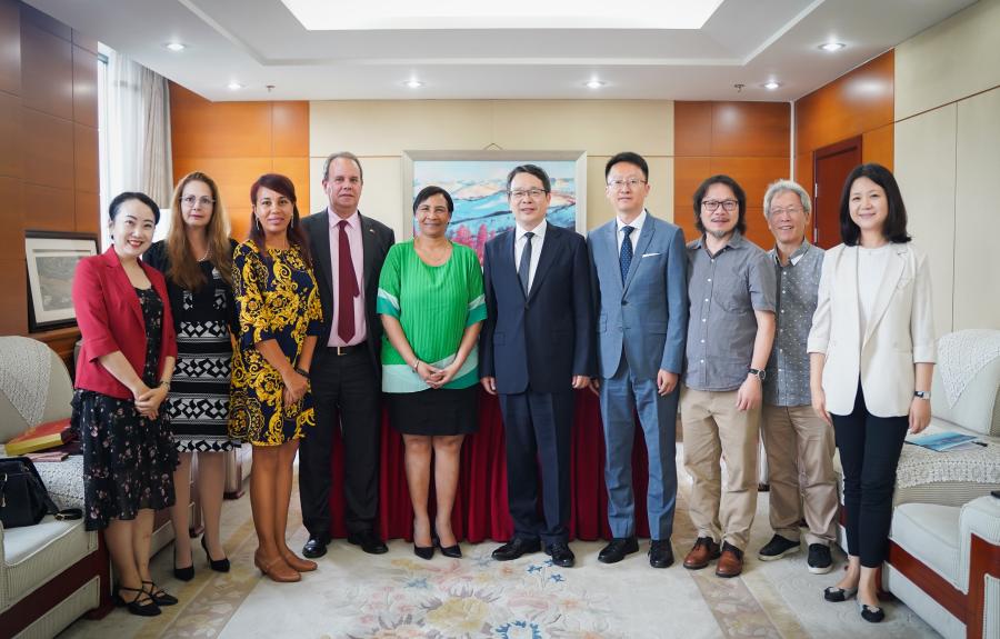 我校国际交流与合作处处长钟丹丹、新闻传播学部副部长何苏六教授、人类命运共同体研究院副院长王四新教授、外国语言文化学院副院长刘颖副教授等参加了会见,并各自就邀请哈瓦那大学参加“一带一路”纪录片学术共同体,共建哈瓦那大学人类命运共同体研究中心和西班牙语人才联合培养等事宜与加西亚进行了交流。