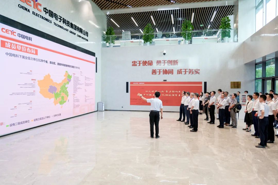 座谈交流前,廖祥忠、张树庭一行参观了中国电科智能科学园展厅,系统了解了中国电科的企业精神与文化、发展定位与布局以及在支撑国家高水平科技自立自强中作出的突出贡献。