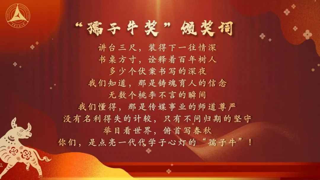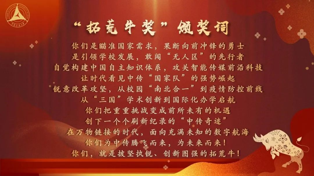 张树庭指出,“三牛奖”的落地,进一步优化了我校教师荣誉体系,彰显了“不让勇于担当的老实人吃亏”的中传干事文化,对更好地激发广大教职员工担当作为的热情和决心,激励大家积极投身学校事业和教育强国建设实践,具有十分重要的意义。他希望受到表彰的个人和团体再接再厉,希望全体教职员工向身边榜样学习,大力弘扬“三牛”精神,激发工作动能,强化使命担当,为中传的升级腾飞再立新功!