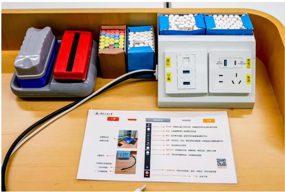 改造后的教室,操作指南简洁清晰,一目了然。全新的讲台可满足教师不同状态的授课需求。除传统的设备接入方式外,教室大屏还可实现一键投屏分享,课堂信息呈现更加便捷丰富。